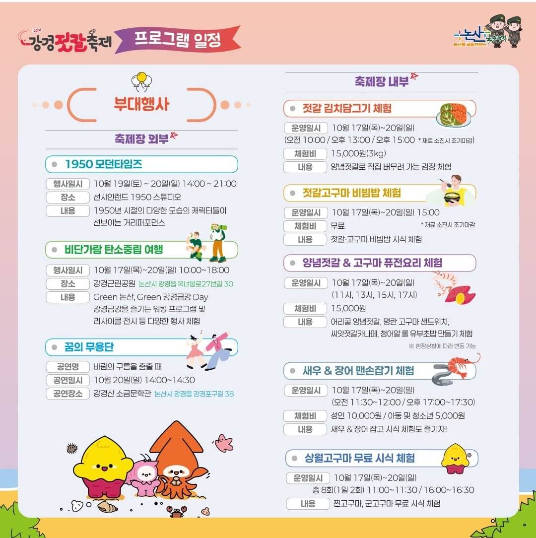 2024 강경 젓갈축제는 개막식과 다양한 공연 및 경연대회 등이 진행됩니다. 다양한 체험마당 및 부대행사도 진행되니 참고 부탁드립니다. 2024 강경 젓갈축제는 무료로 진행되며, 체험행사 중 유료로 진행되는 행사가 있는 점 확인 바랍니다.