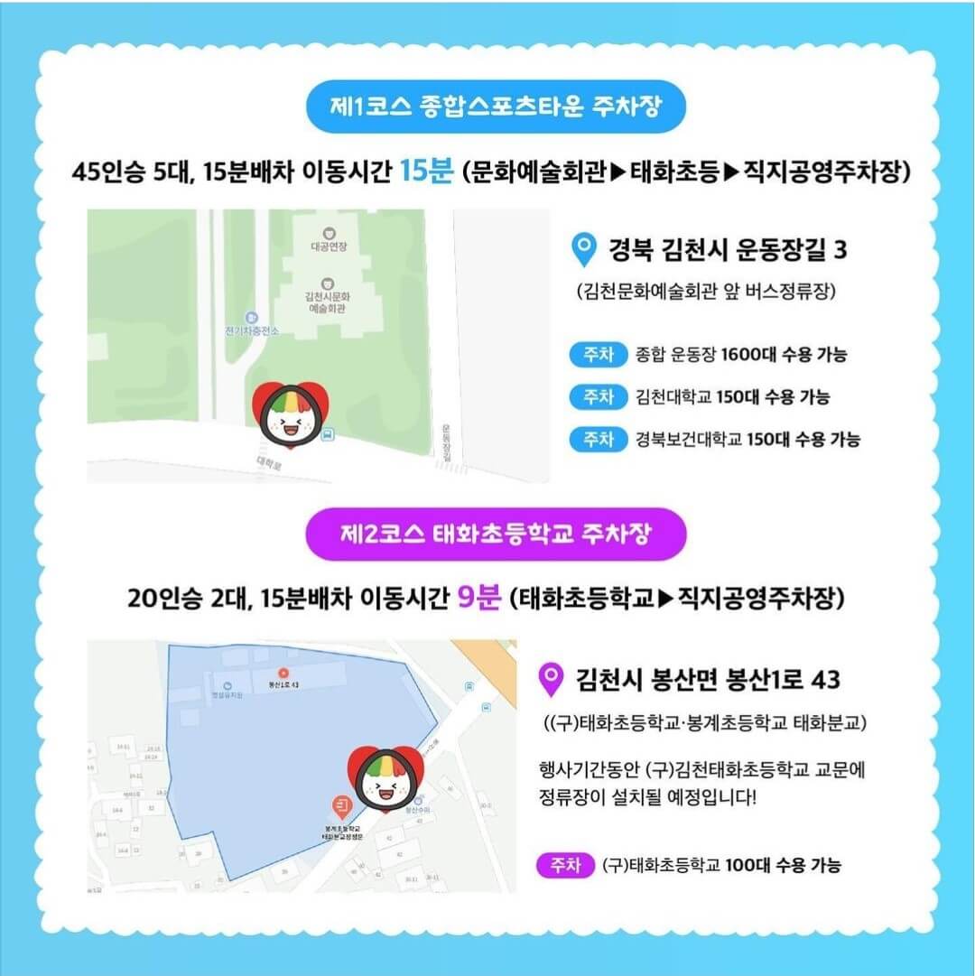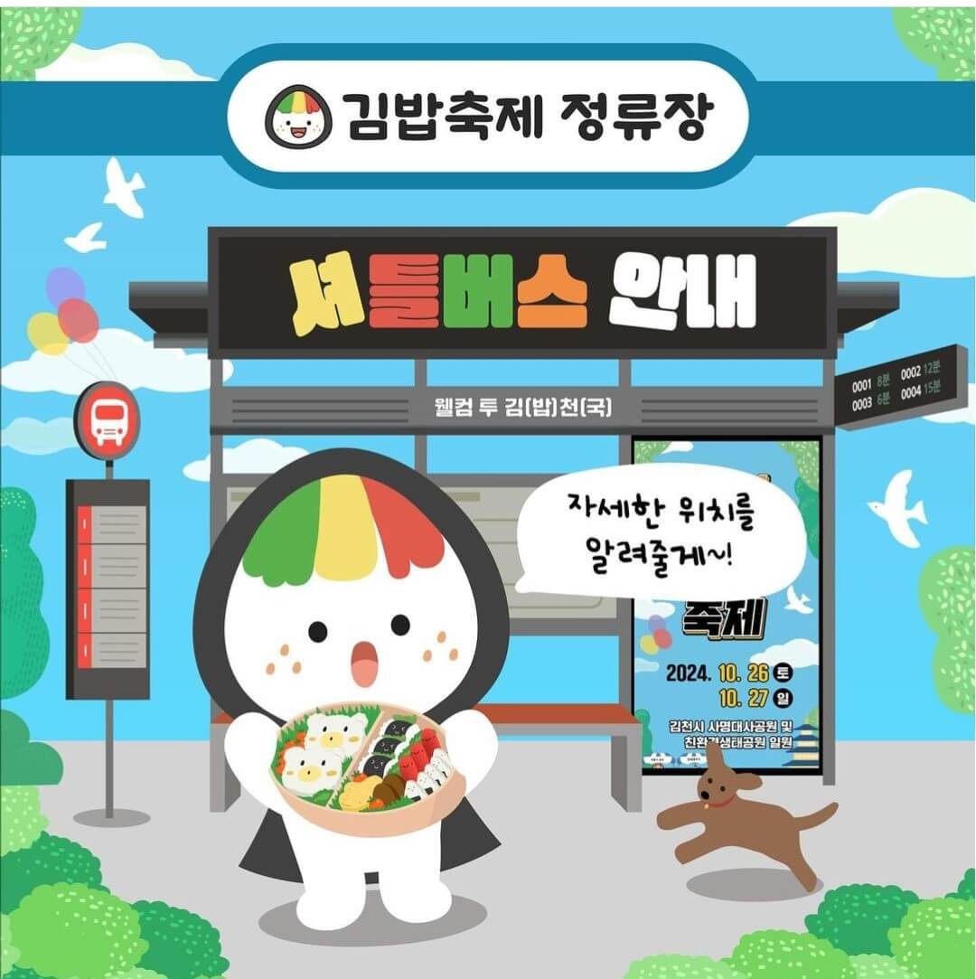 2024 김천 김밥축제는 셔틀버스가 운행됩니다. 셔틀버스 승강장 주변에 임시 주차장도 운영되고 있으니 참고하여 이용해 보시기 바랍니다.