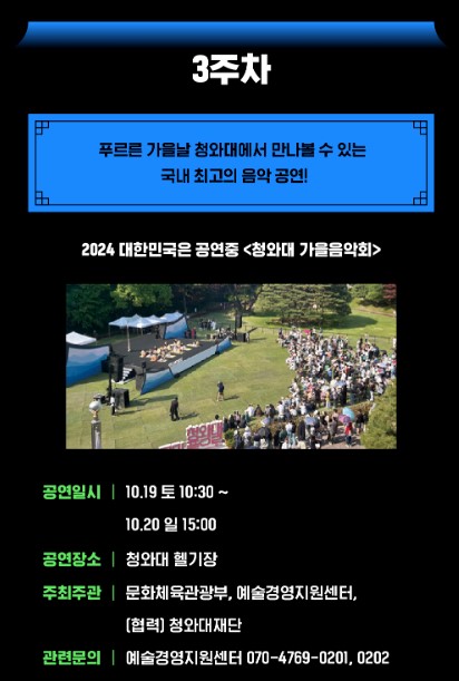 | 3주차 | 10.19(토) | 10:30 | 청와대 헬기장 | 청와대 가을음악회 | |