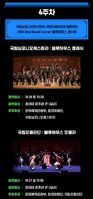 | 4주차 | 클래식 | 10.26(토) | 15:00 | 청와대 춘추관 | 국립심포니오케스트라 |