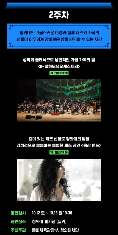 | 2주차 | 성악과 클래식 | 10.12(토) | 19:30 | 청와대 헬기장 | K-필하모닉오케스트라 |