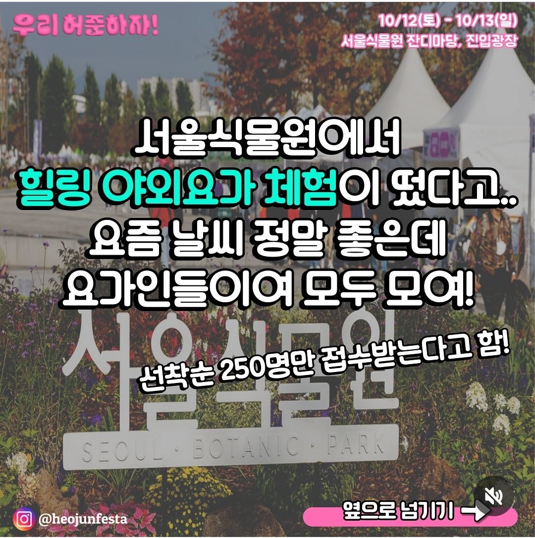 2024 허준축제가 10월 12일부터 서울식물원에서 진행됩니다. 허준 축제를 맞아 다양한 체험 프로그램이 준비되어 있습니다. 서울식물원 잔디밭에서 진행하는 힐링요가와 어린이들이 참여할 수 있는 허주니어 선발대회는 선착순으로 신청을 받고 있으니 확인 후 참여해 보시기 바랍니다.